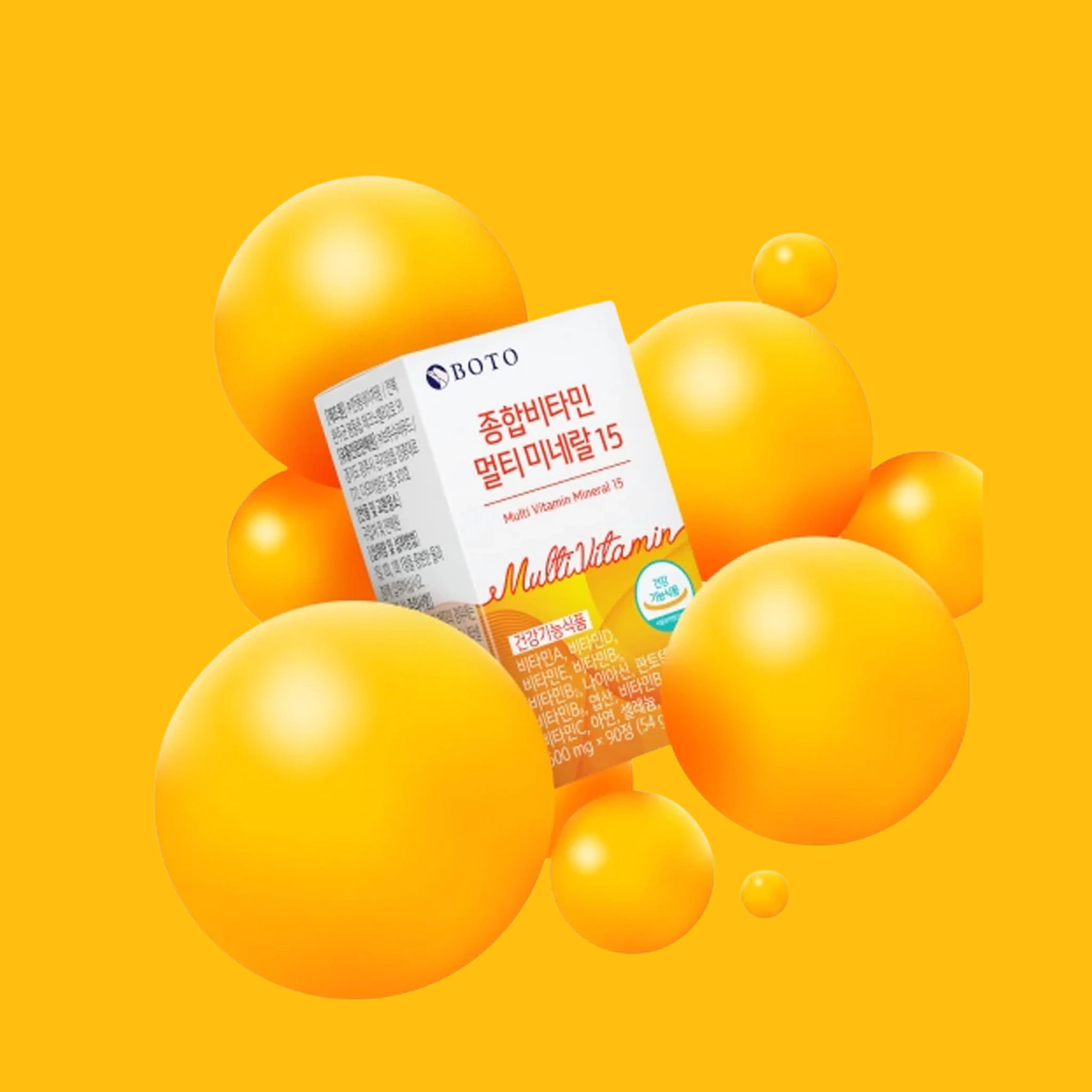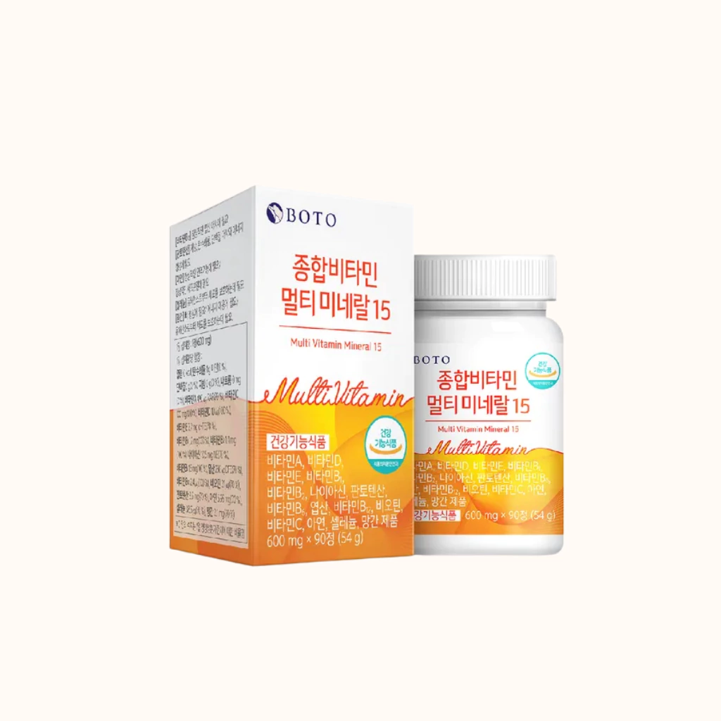 El [BOTO] Multi Vitamin Mineral 15 600mg*90ea es un suplemento vitamínico y mineral que combina 15 vitaminas y minerales esenciales en una cápsula para apoyar tu salud integral. Su fórmula está diseñada para brindar un refuerzo nutricional, mejorar el bienestar general y mantener el equilibrio de nutrientes en el cuerpo. Con 90 cápsulas por envase, es un producto ideal para el consumo diario y la mejora de la energía, la piel, el sistema inmune y mucho más.